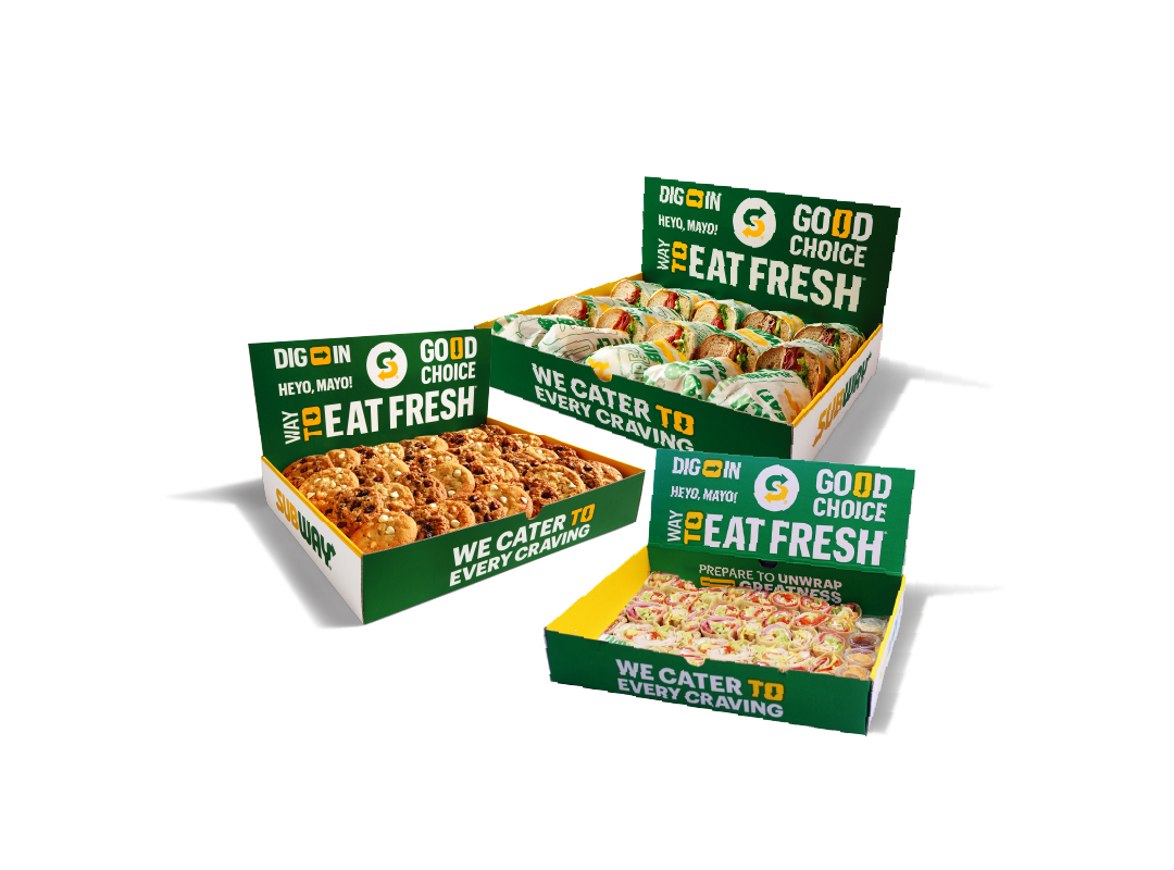 1 bandeja de subs clásica a escoger entre Pavo, Jamón, Pavo y Jamón. 1 bandeja de 24 galletas. 1 bandeja de Miniwraps.